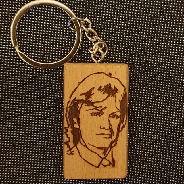Porte clef en chêne avec chaînette métallique.